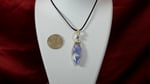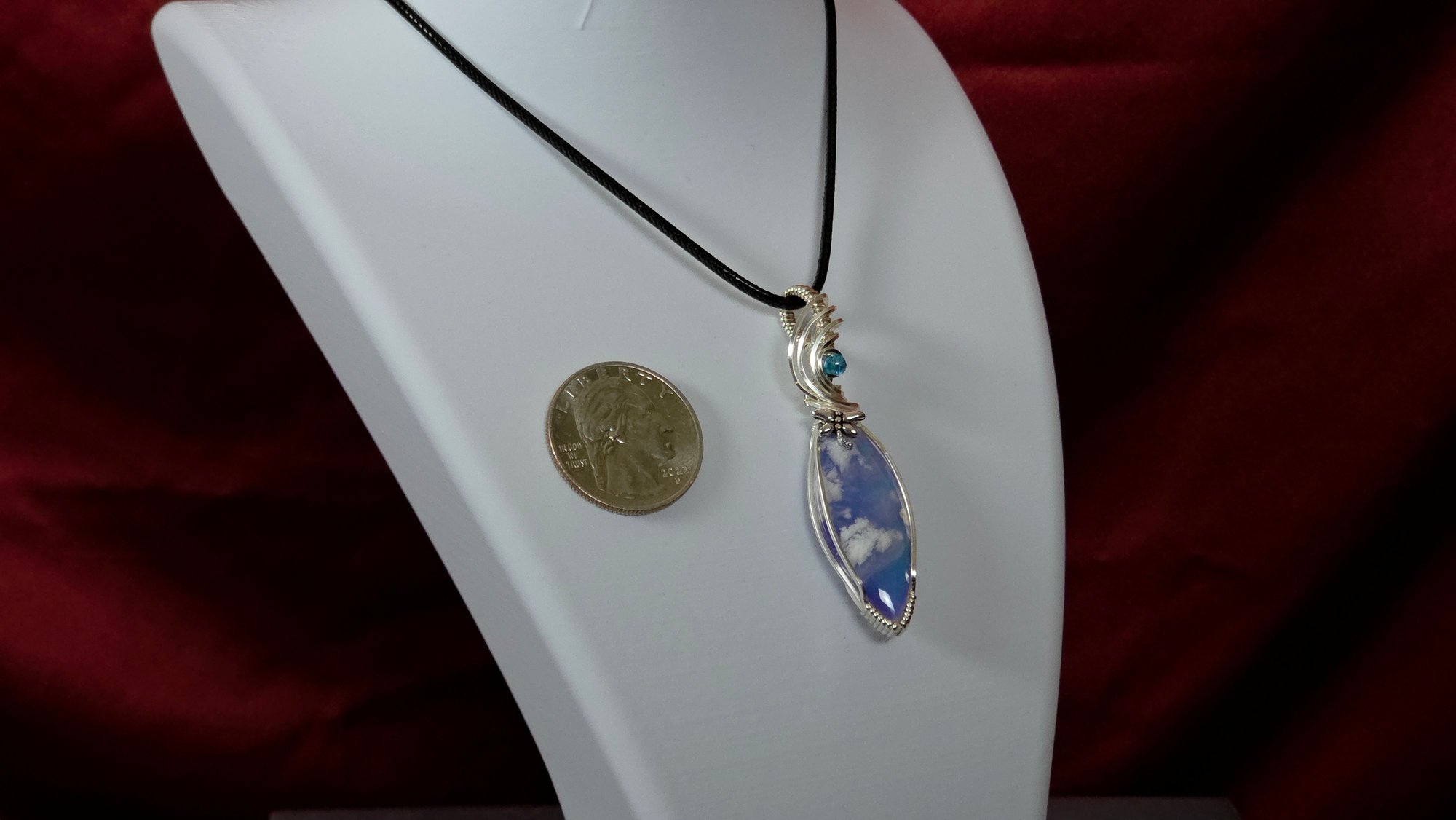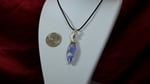 Stunning blue marquise plume doublet agate with blue crystal bead and dragon fly charm wrapped in tarnish resistant silver parawire.